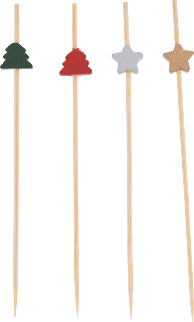 Jouluinen cocktailtikku 20 kpl/pkt. Materiaali puu. Tikun pituus 12 cm. Pakkauksessa kuvioina vihreä ja punainen kuusi sekä hopean- ja kullanvärinen tähti.