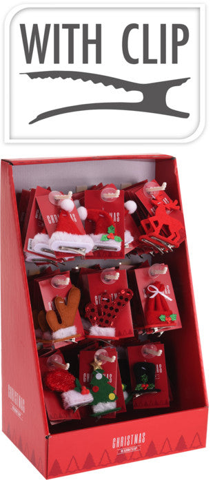 Hiusklipsin koko 5x9 cm. 9 erilaista: tonttulakkeja, poronsarvia, poro, joulukuusi, lumiukon silinteri.
