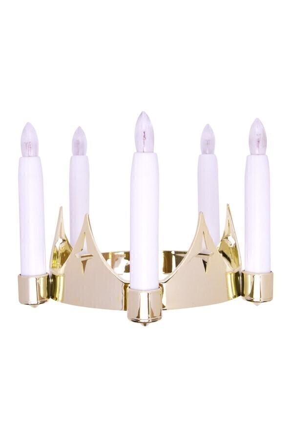 Kullanvärinen Lucia-neidon kruunu kynttilöillä. Kruunun suurin ympärysmitta on noin 54 cm. Tarvittaessa voidaan säätää pienemmäksi. Kynttilät 5 kpl toimivat jokainen omalla paristolla, AA 1,5 V. Paristot eivät sisälly pakkaukseen.