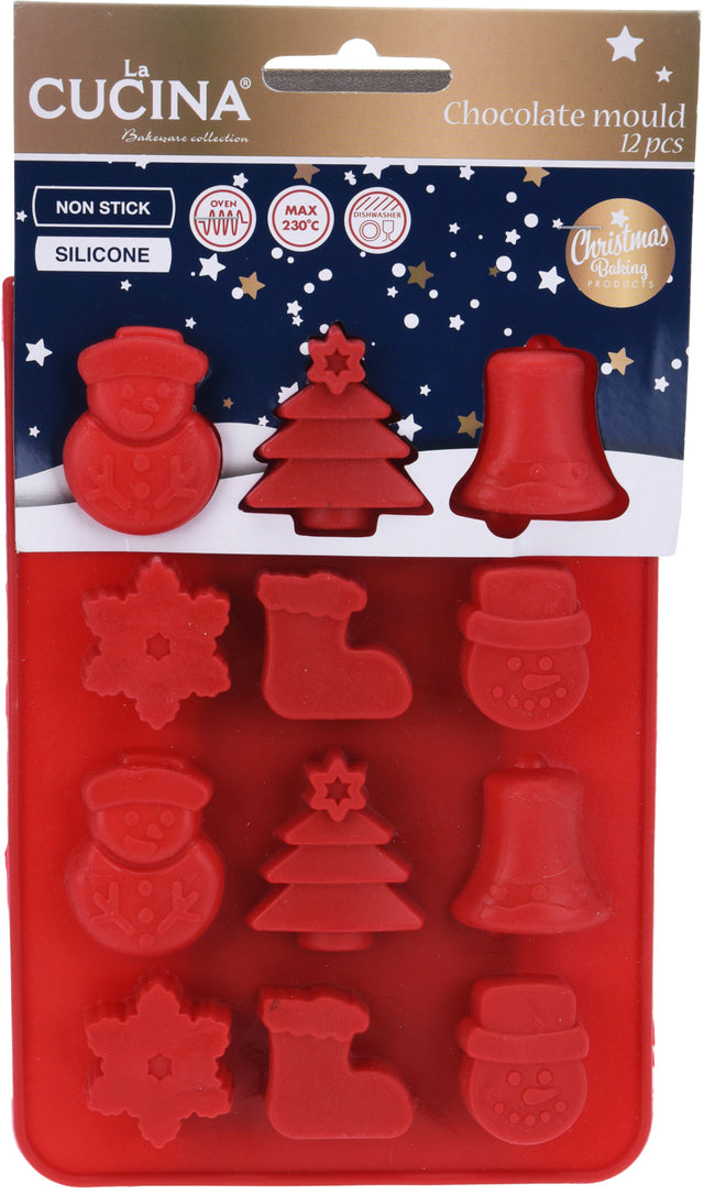 Suklaamuotti 12 suklaalle. Aiheina joulukuusi, joulukello, lumiukko, lumihiutale ja joulusukka. Materiaali silikonia. Voidaan laittaa uuniin max. 230 astetta. Konepestävä.