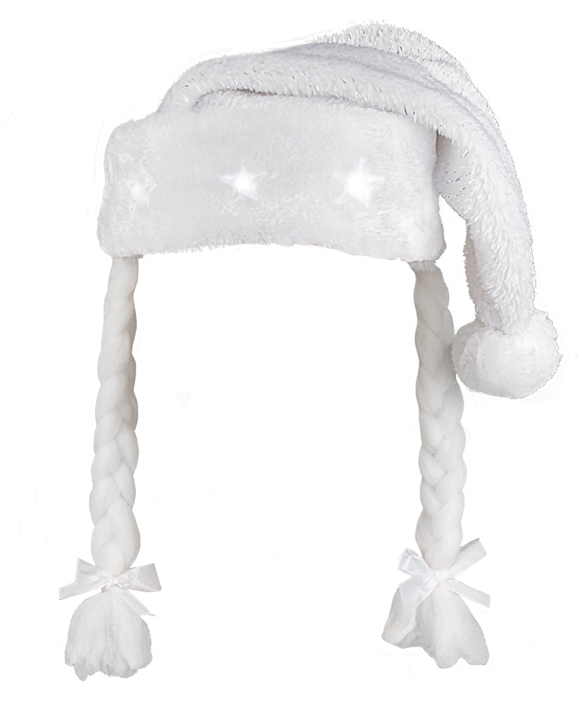Valkoinen tekokarvainen tonttulakki, pinnassa hieman hopeankimallusta. Lakissa sivuilla kiinteät valkoiset letit. Etuosassa neljä vilkkuvaa tähtilamppua. Paristot (3xLR44) kuuluvat pakkaukseen. Aikuisten koko.