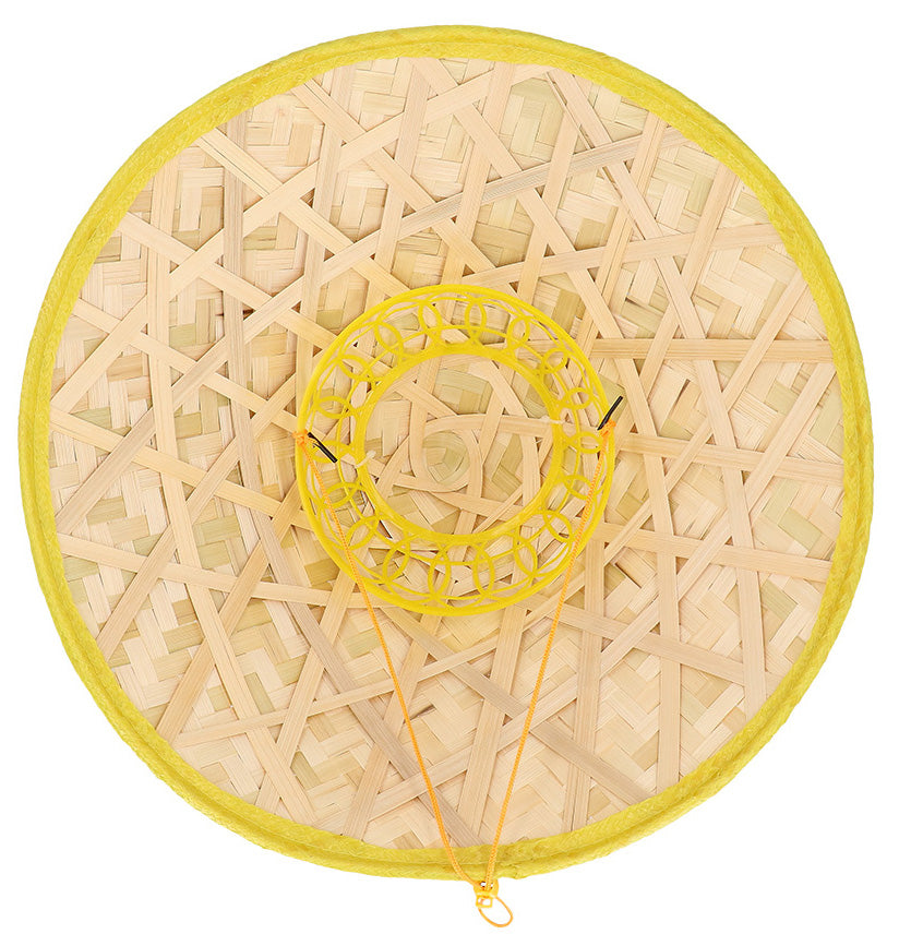 Kaislahatussa leuan alle kiinnitettävä nyöri tai voit roikottaa sitä selän puolella. Kaislahattu ommeltu kasaan ja sen reunoja kiertää kellertävä punos.