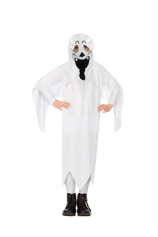 Kaavun helma on aavemaisesti sahalaitainen ja hihoissa on leveät liehukkeet kummittelua varten. Huppunaamarissa silmäaukot sekä mustalla painettu kummitusmainen ilme.