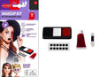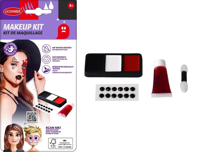 Mini maskeeraussetti sisältää mustan, valkoisen ja harmaan kasvovärin (1 g kutakin väriä), 3,5 ml tuubin tekoverta, kaksipäisen applikaattorin ja 12 kpl mustia tekojalokiviä. Tällä setillä voit tehdä itsestäsi esimerkiksi vampyyrin tai paholaisen.