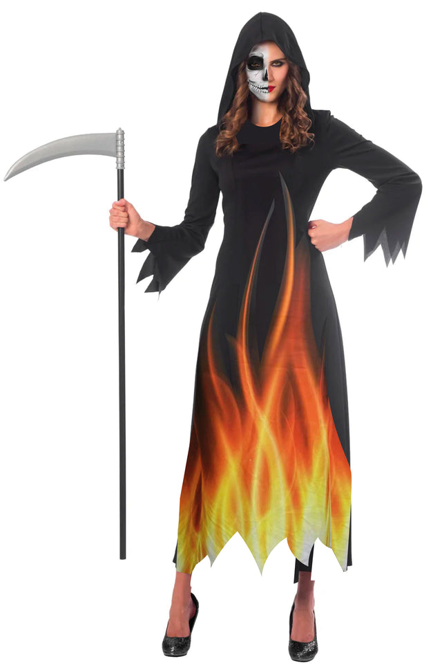 Viikatemiesasu naisille koossa L (40/42). Hupullisen, mustan kaavun helmassa on liekkikuviointi.