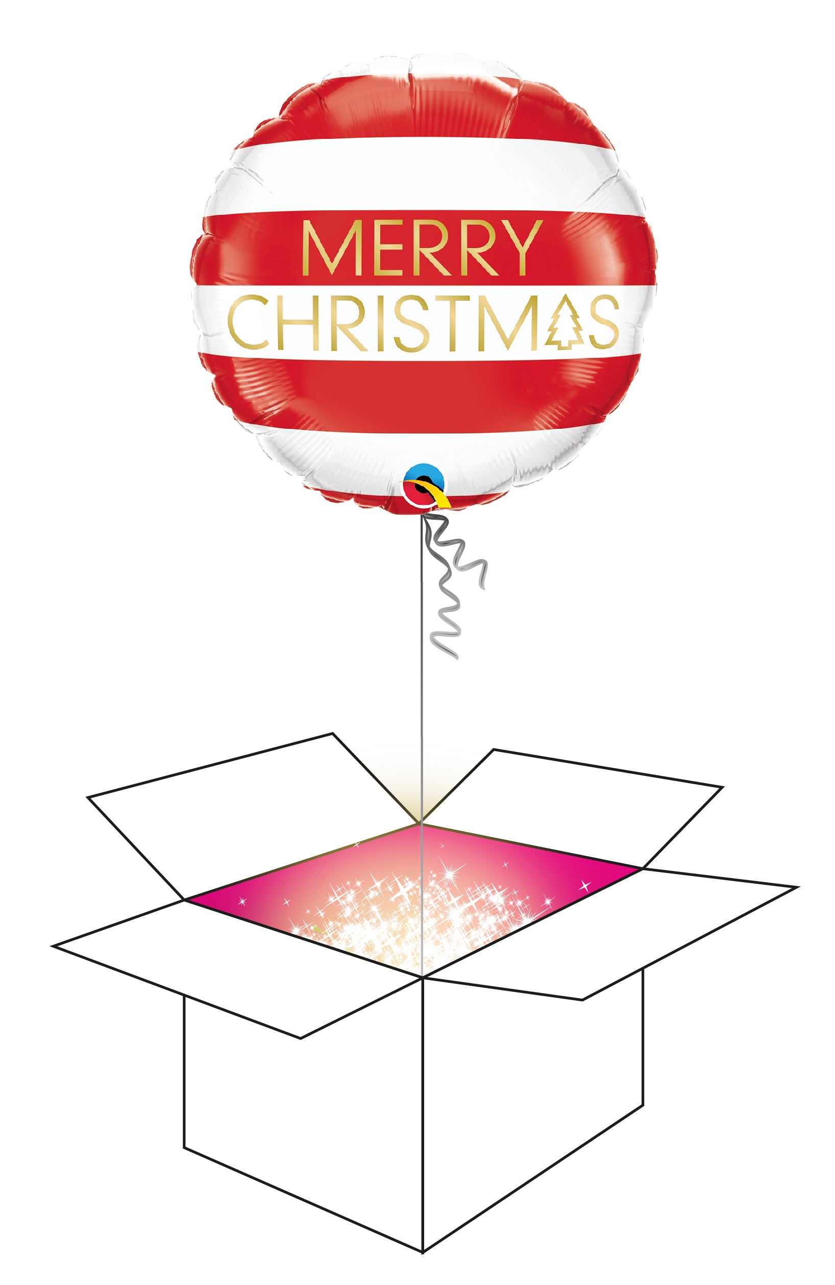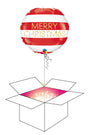 Merry X-mas -foliopallo heliumilla täytettynä. Tuote sisältää yhden foliopallon, jonka koko on täytettynä noin 40 cm. Palloon on kiinnitetty myös pallopaino, ettei se pääse karkaamaan.