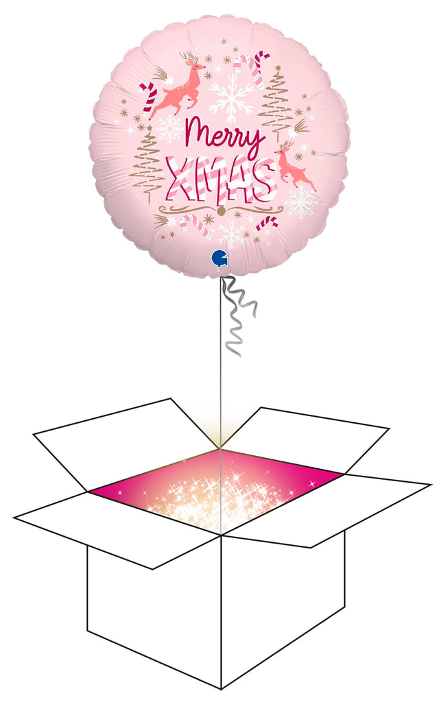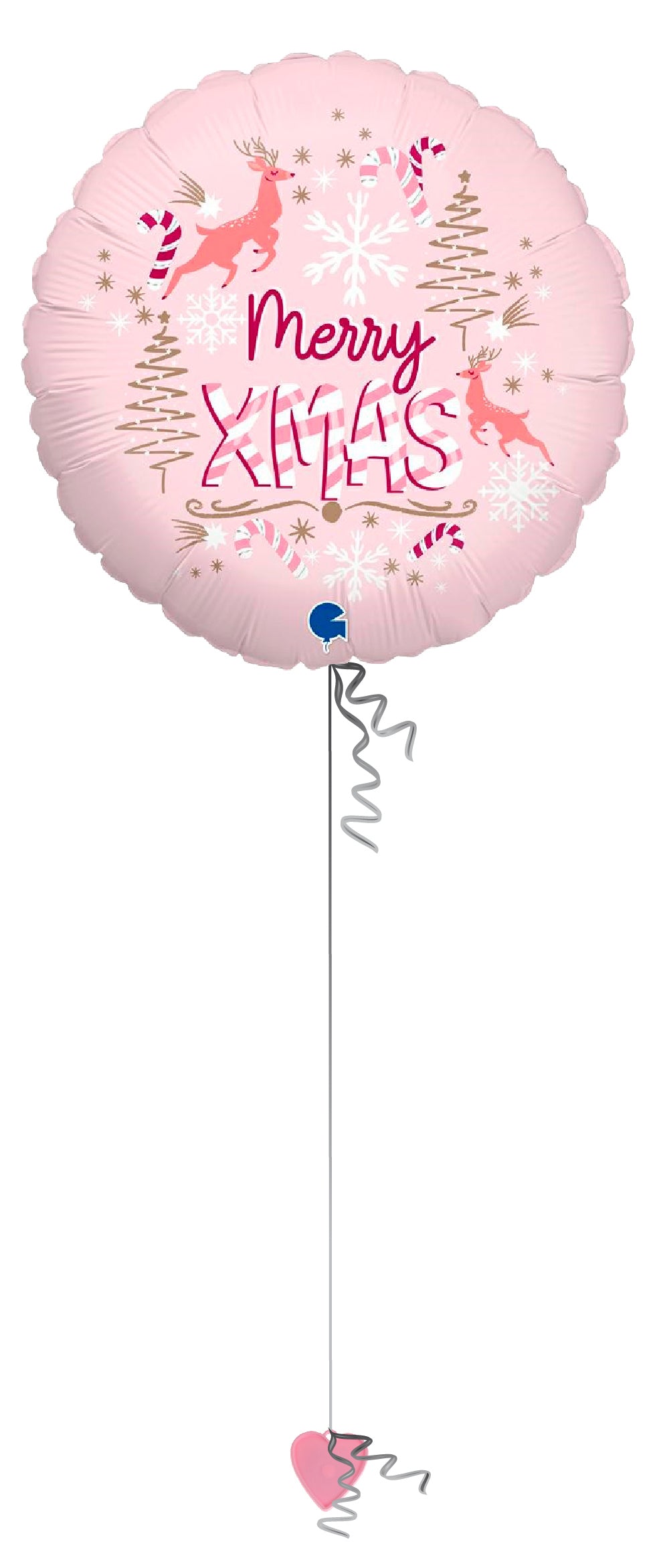 Vaaleanpunainen Merry X-mas-foliopallo heliumilla täytettynä. Tuote sisältää yhden foliopallon, jonka koko on täytettynä noin 40 cm. Palloon on kiinnitetty myös pallopaino, ettei se pääse karkaamaan.