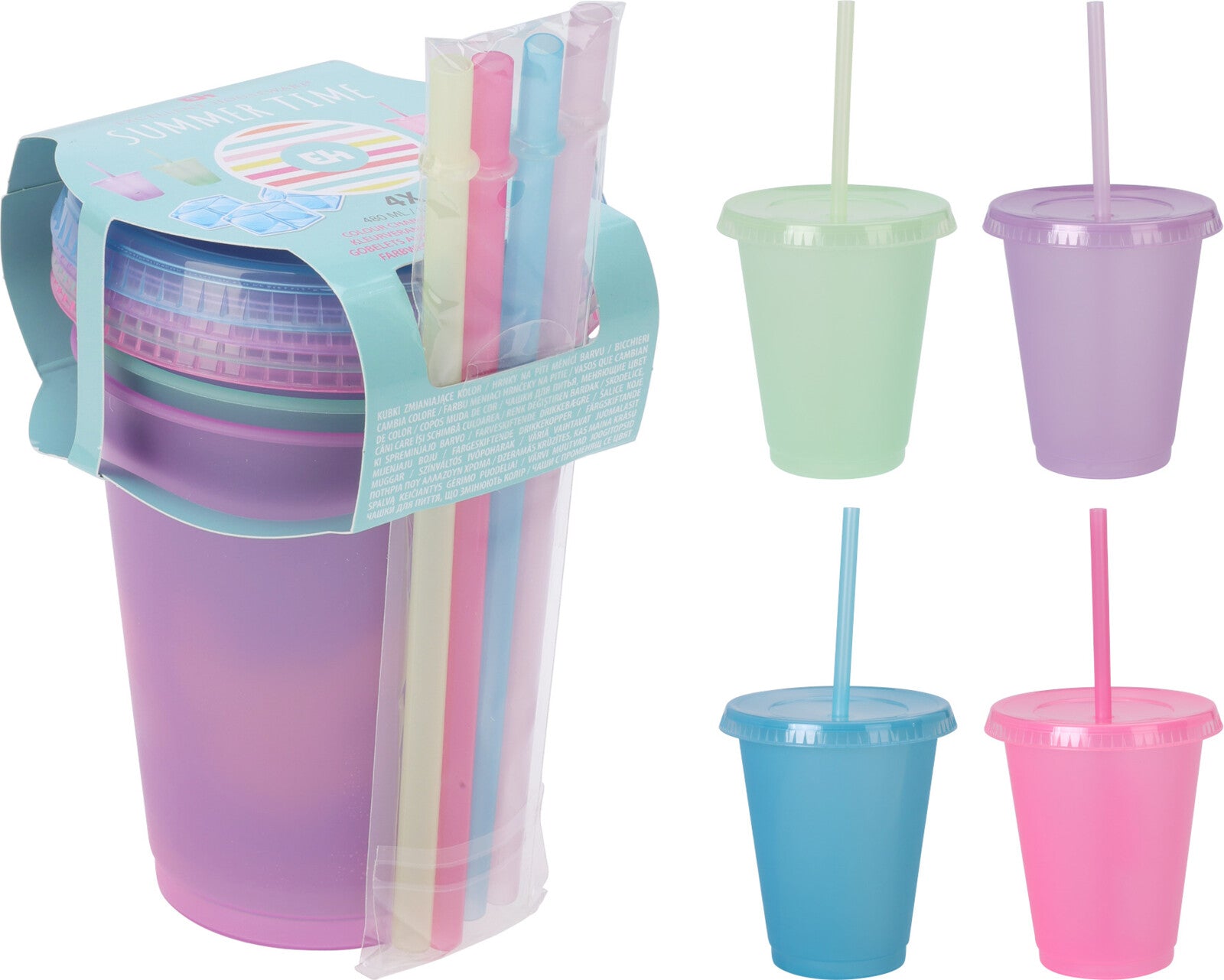 Paketissa neljä eriväristä väriä vaihtavaa mukia.
