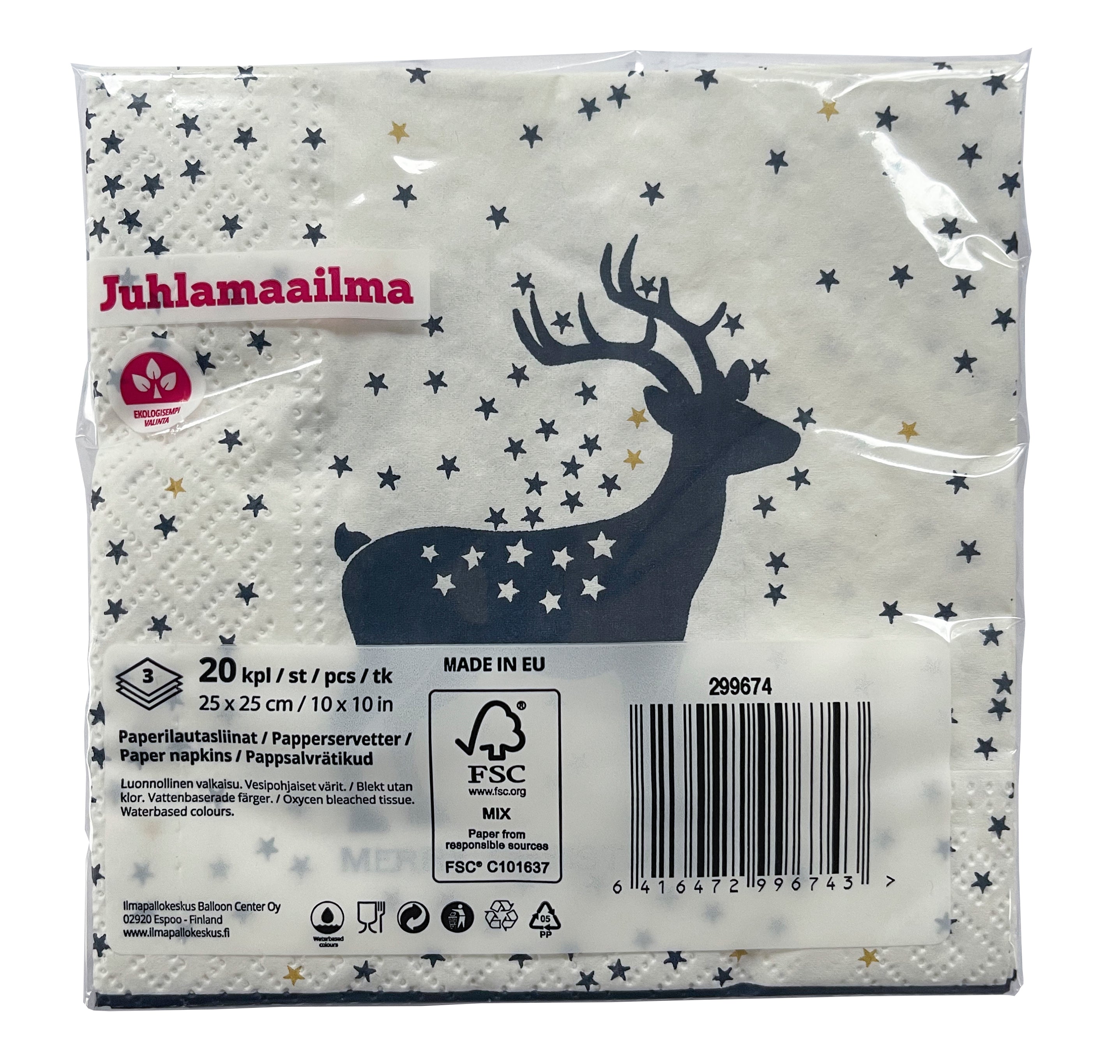 Pakkaus sisältää 20 kpl paperilautasliinoja. Lautasliinan koko on avattuna 25x25 cm.