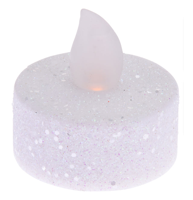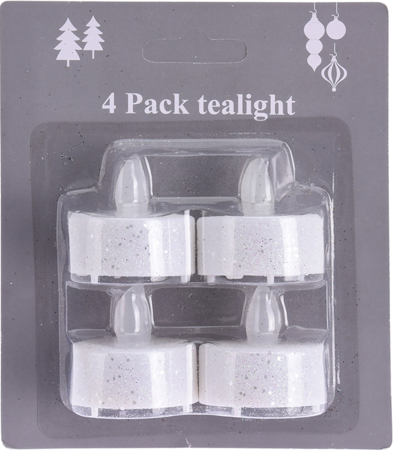 Valkoinen kimallepintainen led-lämpökynttilä kellertävällä valolla 4 kpl/pkt. Kynttilän koko on noin 3,5 x 2 cm. Paristot CR2032 sisältyvät pakkaukseen.