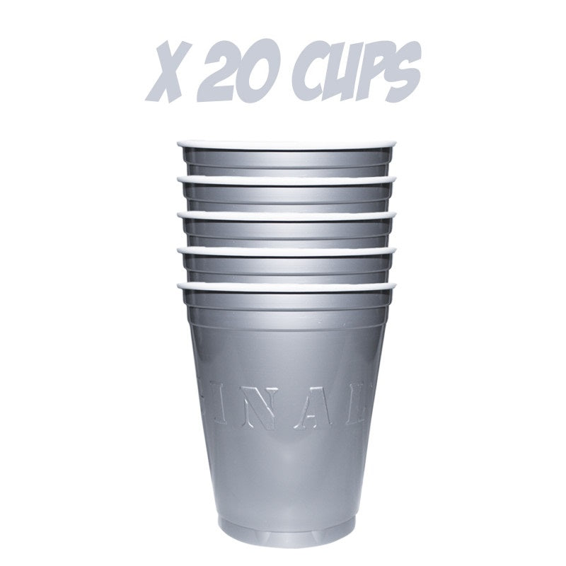 Pakkauksessa on 20 kpl tukevia, tiskikoneen kestäviä, uudelleen käytettäviä hopeanvärisiä muovimukeja. Mukin tilavuus on 530 ml.