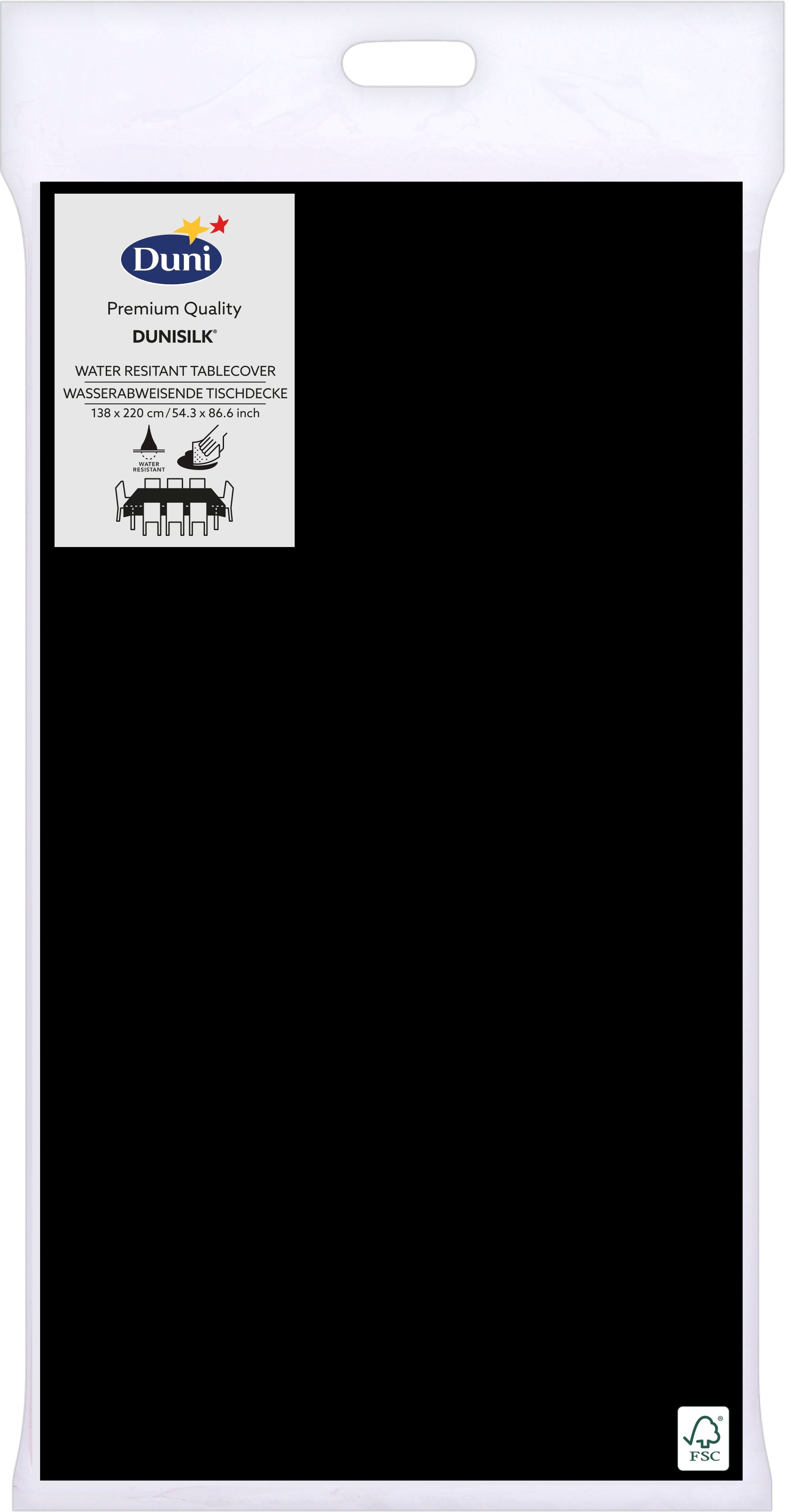 Musta pöytäliina, Dunisilk -materiaalia. Pinta kosteuttahylkivä ja pyyhittävä, kääntöpuoli paperinomaista materiaalia. Paksu ja tukeva pöytäliina kestää käyttöä. Pöytäliinan koko on 138 x 220 cm.