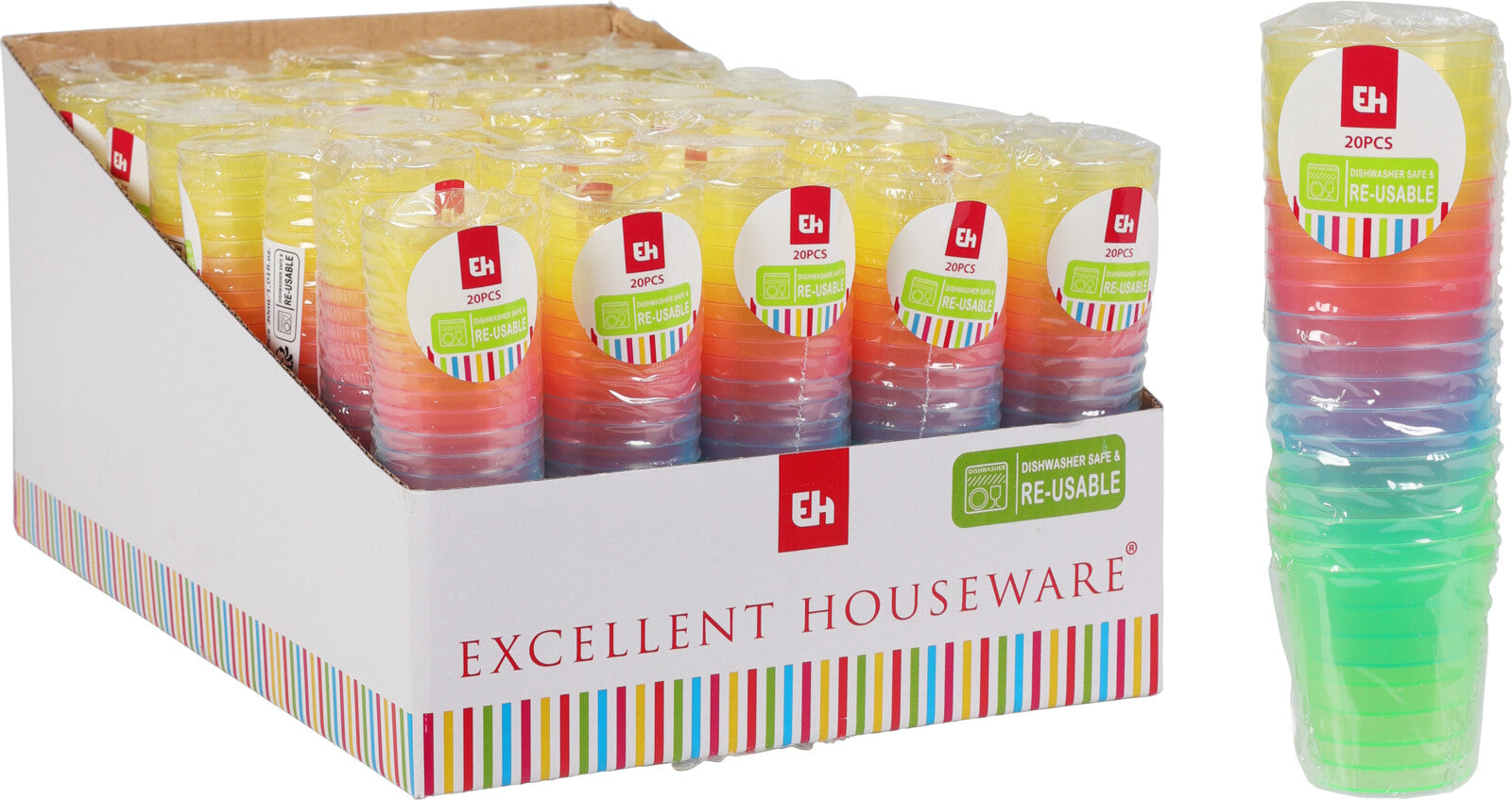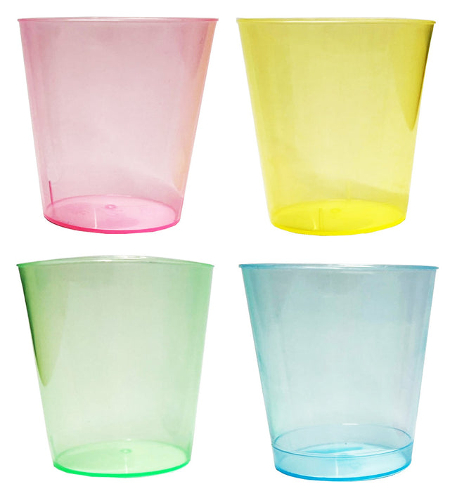 Muoviset shottilasit 30 ml 20 kpl/pkt. Yhdessä paketissa on lajitelma erivärisiä shottilaseja: vihreä, pinkki, keltainen ja sininen. Shottilasit voi pestä astianpesukoneessa ja käyttää uudelleen.