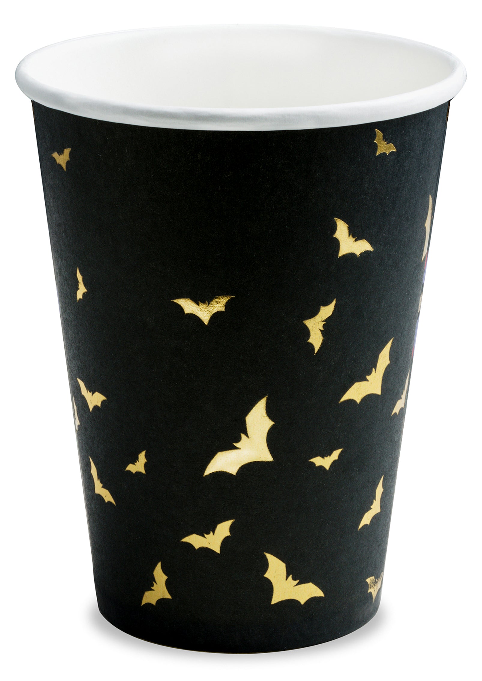 Mustassa pahvimukissa lentelevät kiiltävät kullanväriset lepakot. Yhdistä tyylikkääseen kattaukseen muita Trick or treat -sarjan tuotteita.