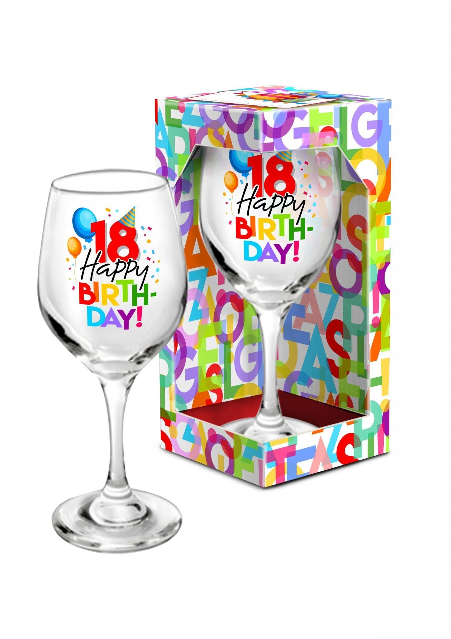 Viinilasi Happy Birthday -tekstillä ja ikävuosilla. Tekstiä täydentää värikäs syntymäpäiväteemaan sopiva kuvitus ilmapalloineen.