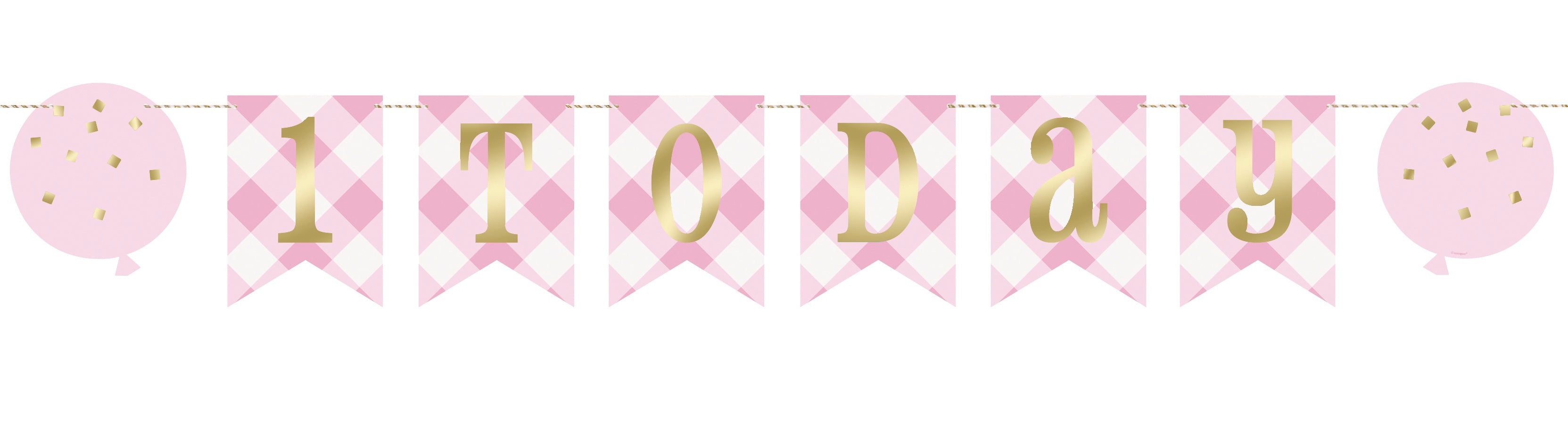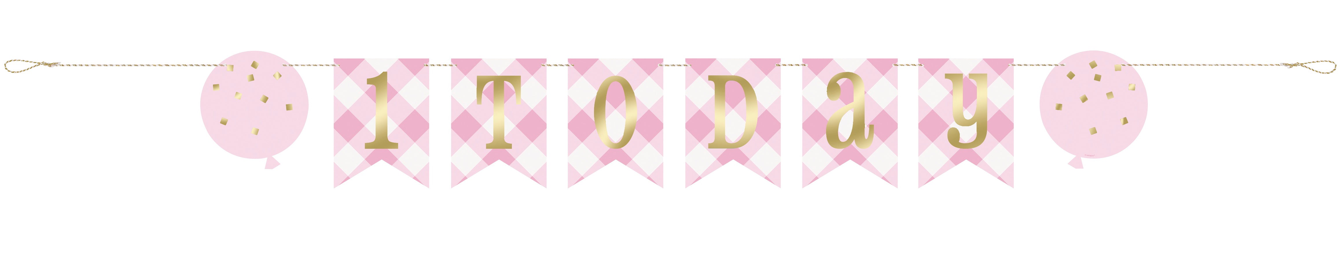 Tyylikäs kullanvärinen teksti ja vaaleanpunainen ruutukuvio. Nauhan päissä ilmapallon kuvat.