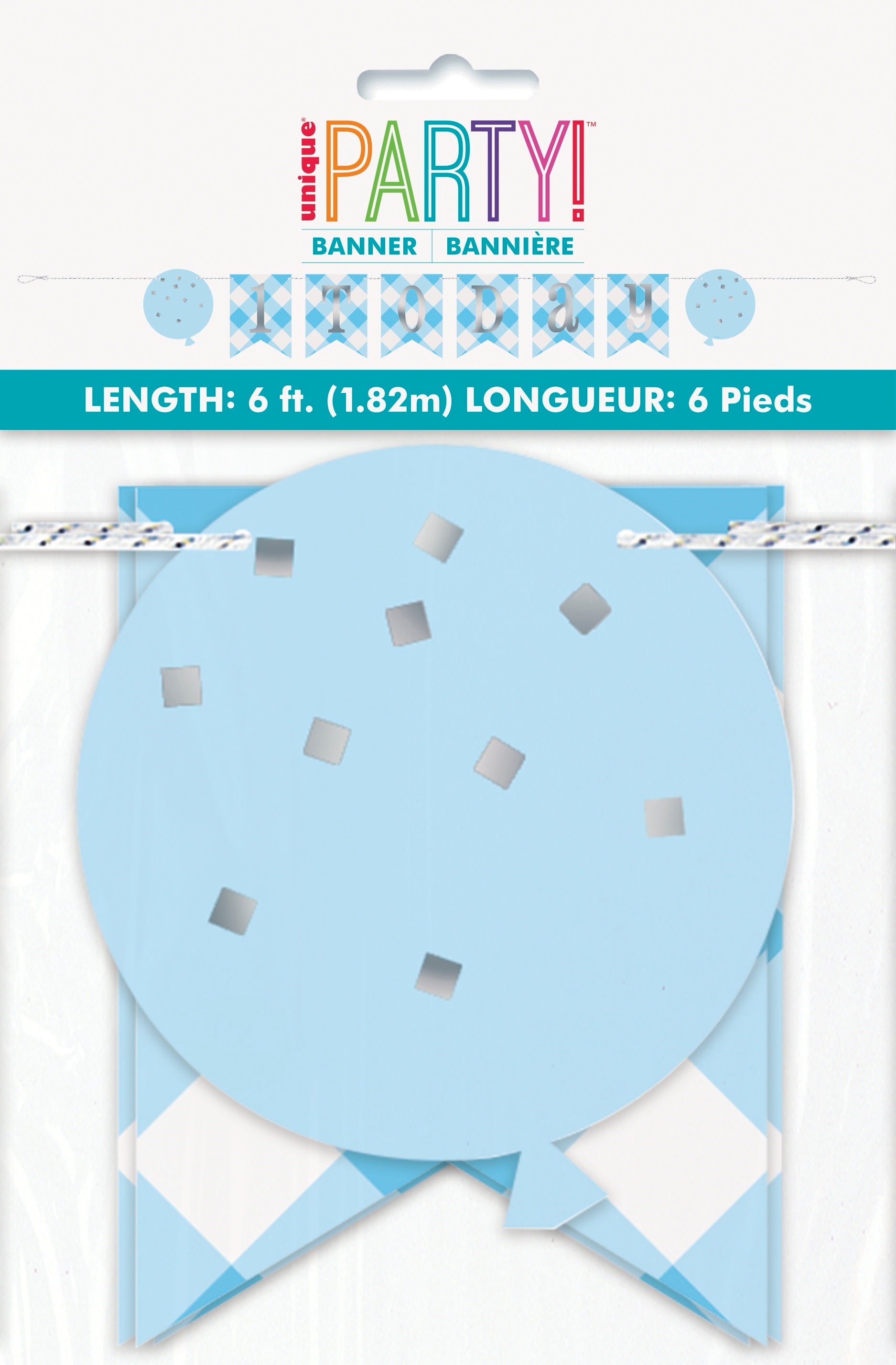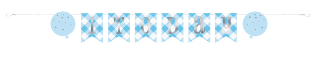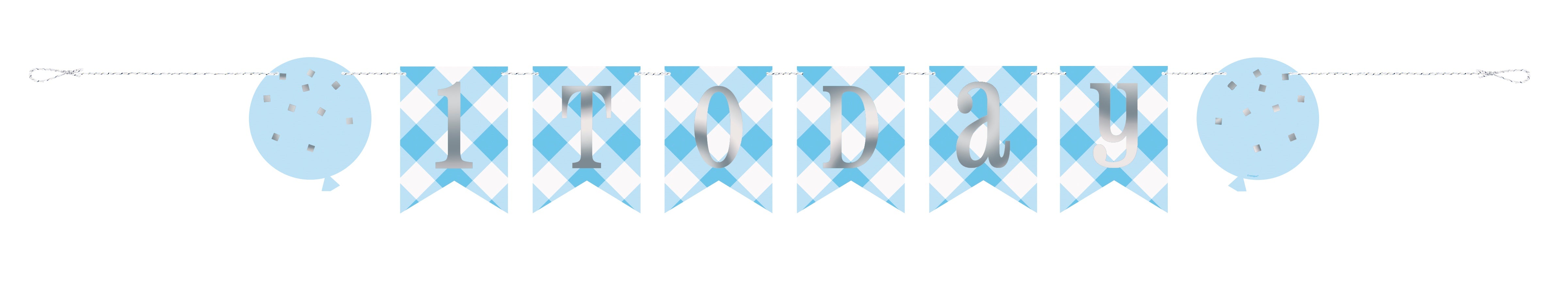 Ruutukuvioinen viirinauha ilmapallon kuvilla. Viirinauhassa hopeanvärinen teksti 1 today. Pahvisen viirinauhan pituus on noin 1,8 m.