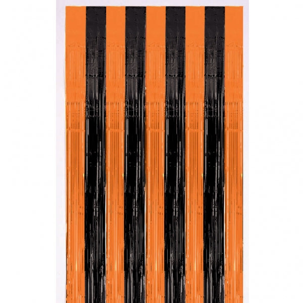 Kaksivärinen lamee oviverho. Oviverhossa vuorotellen oranssin sekä mustan värit. Verhon korkeus 1,8 m.