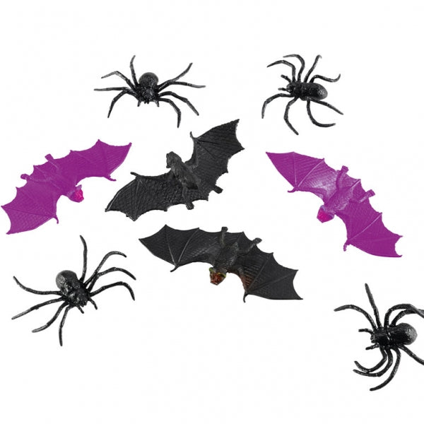 Yhteensä 6 ötökkää pussissa. Pusseja on saatavilla kahta erilaista. Toisessa on lepakoita ja toisessa on hämähäkkejä. Osa lepakoista on violetin värisiä.