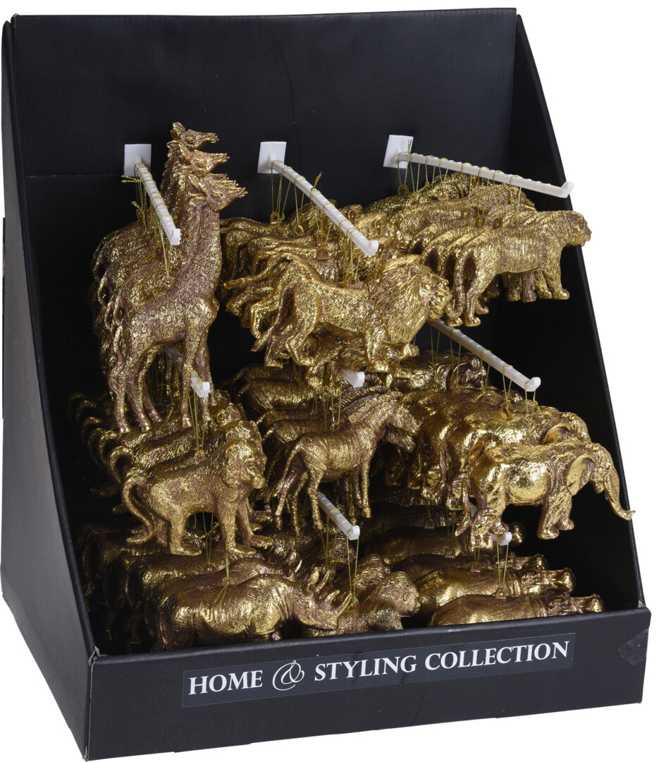 Safari-aiheinen ripustettava antiikkikullanvärinen eläinkoriste kuusenkoristeeksi, Koko noin 12x4x8 cm. 9 eri vaihtoehtoa: kirahvi, seepra, tiikeri, leijona, apina, gorilla, norsu, sarvikuono, virtahepo.
