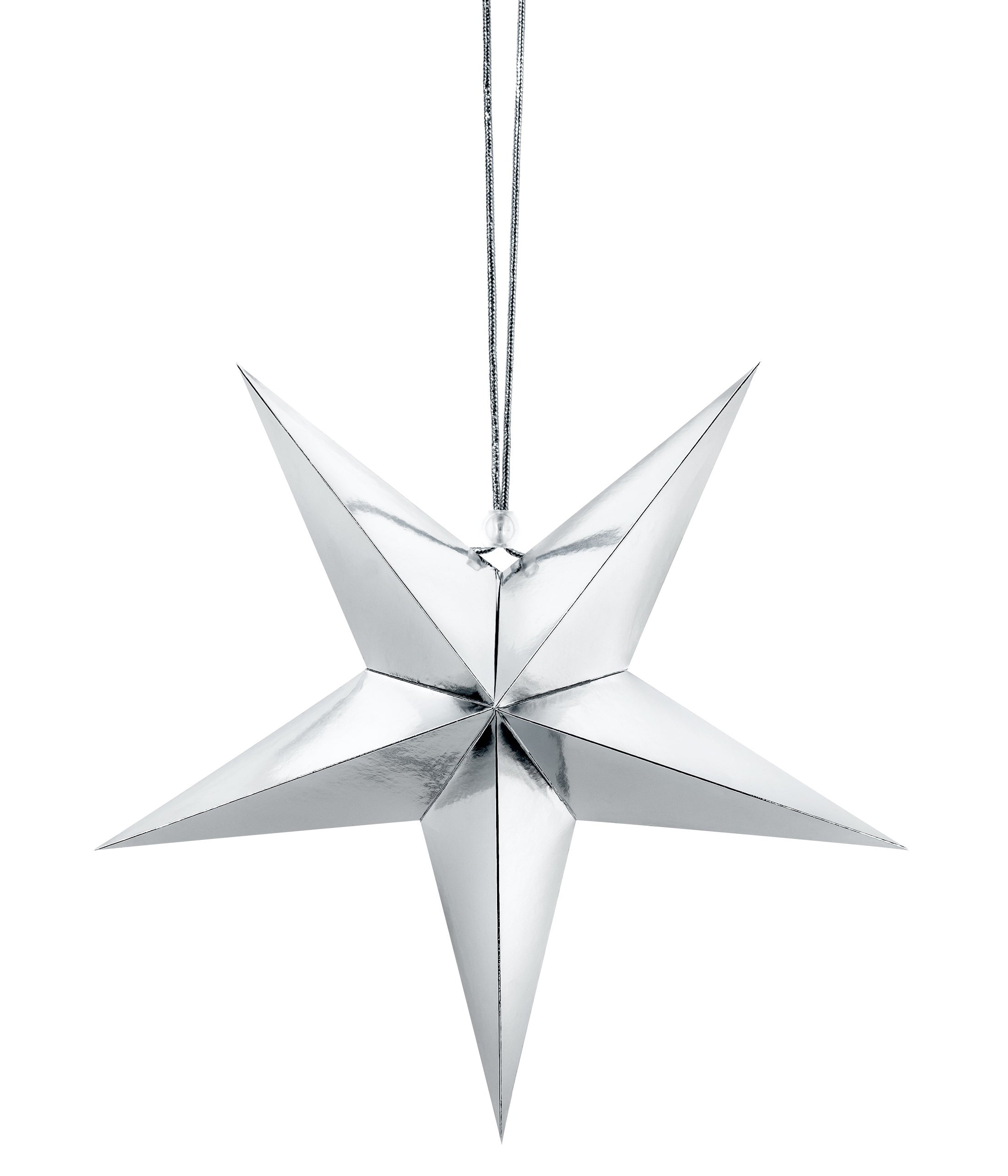 Hopeanvärien tähtikoriste 30 cm. Metallinhohtoinen paperitähti on kiiltävää tukevaa pahvia. Tähdessä on valmiina lyhyt ripustusnaru. Kätevän mekanismin avulla tähti on helppo avata ja taas sulkea säilyksen ajaksi.