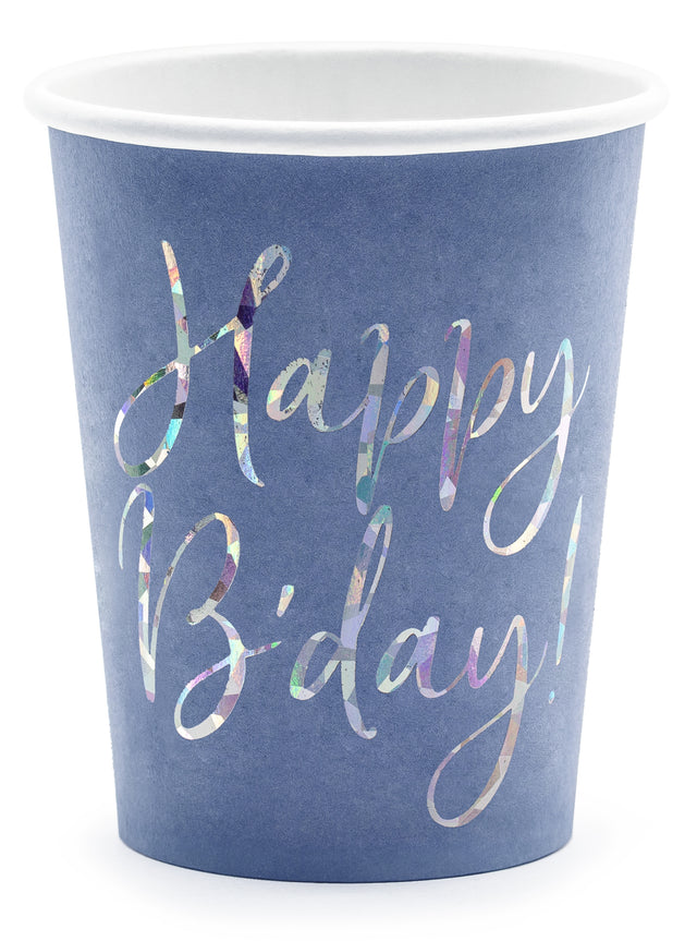 Juhlista syntymäpäivää tyylillä näillä kauniilla Happy B’day! -tekstillä koristelluilla pahvikupeilla. Sinisellä pohjalla hohtava holografinen teksti tuo mukin ilmeeseen juhlavuutta ja modernia tyyliä. Sopii täydellisesti syntymäpäiväjuhliin niin lapsille kuin aikuisillekin. Valmistettu paperista, tilavuus 200 ml. Yhdistä saman sarjan muihin tuotteisiin saadaksesi yhtenäisen kattauksen.