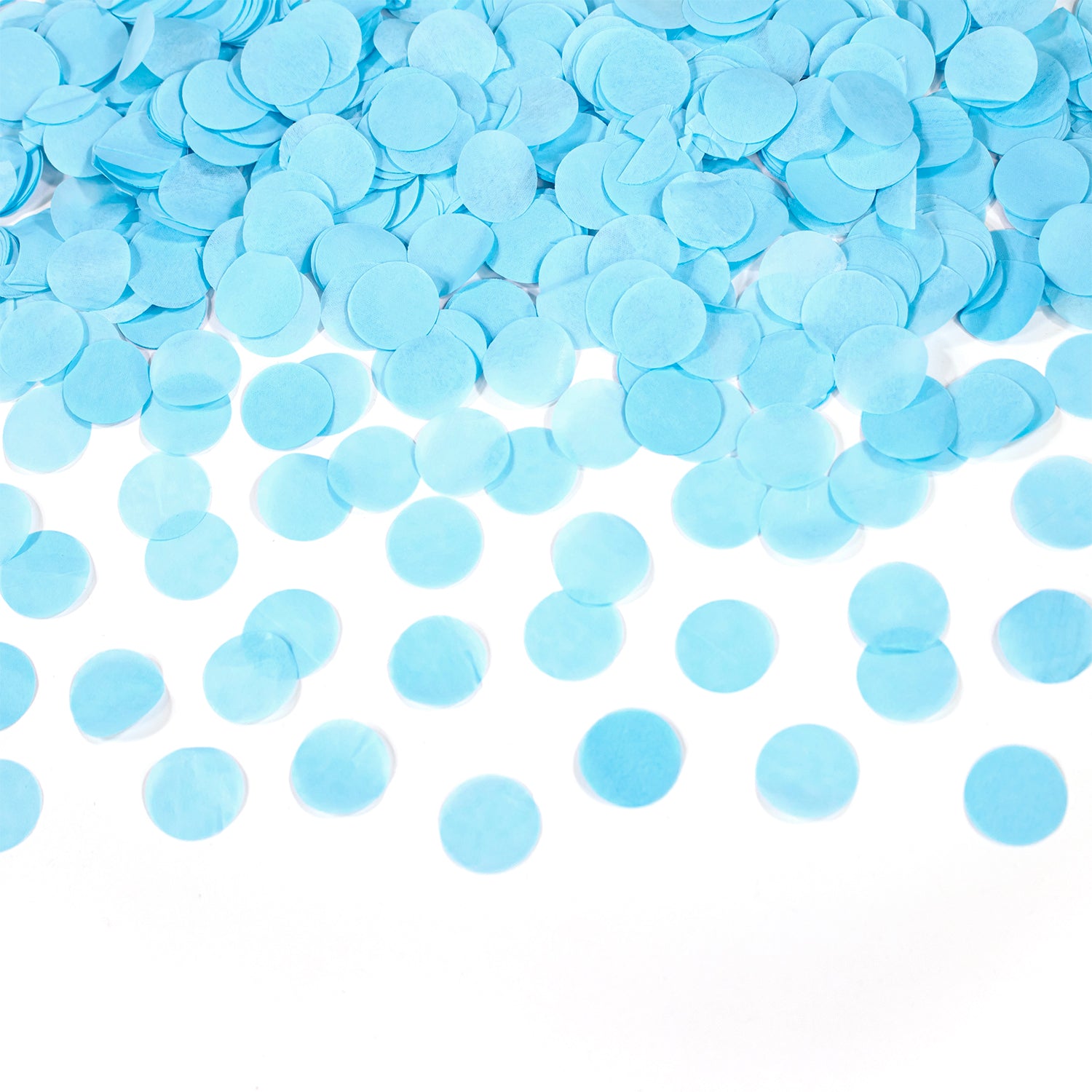 Konfettitykki, jonka sisällä vaaleansinistä paperista konfettia
