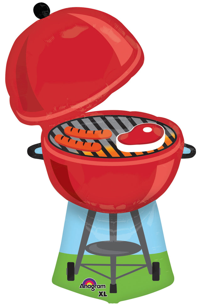 Pallogrillin mallinen foliopallo. Heliumilla täytettynä pysyy ilmassa noin viikon. Kuoren koko ennen täyttöä 51 x 91 cm.