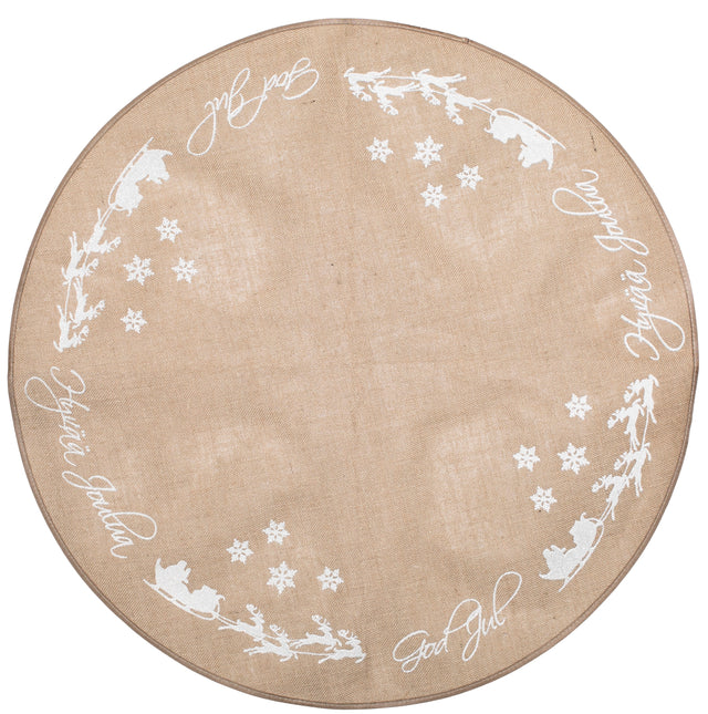 Juuttipintaisessa matossa kauniit valkoiset jouluiset kuviot sekä teksti Hyvää Joulua God Jul.