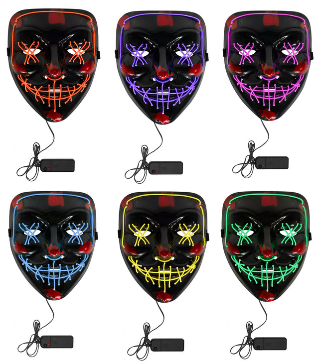 Näyttävä LED-naamari tekee sinusta pelottavan näkyvän – myös pimeässä! Kauhuhenkinen naamari valaisee kasvot karmivalla hymyllä ja siinä on kolme eri valotilaa, jotka tuovat jännitystä joka tilanteeseen. Lajitelmassa on kuusi erilaista ja värikästä mallia, joista jokainen kiinnittää katseet varmasti. Sopii erinomaisesti Halloween-juhliin, rave-bileisiin, kauhukierroksille, cosplayhin tai teemabileisiin. Naamari toimii AA-paristoilla (ei sisälly pakkaukseen). Sekä naisille että miehille. Täydellinen valinta, jos haluat varmistaa, ettei sinua voi olla huomaamatta!