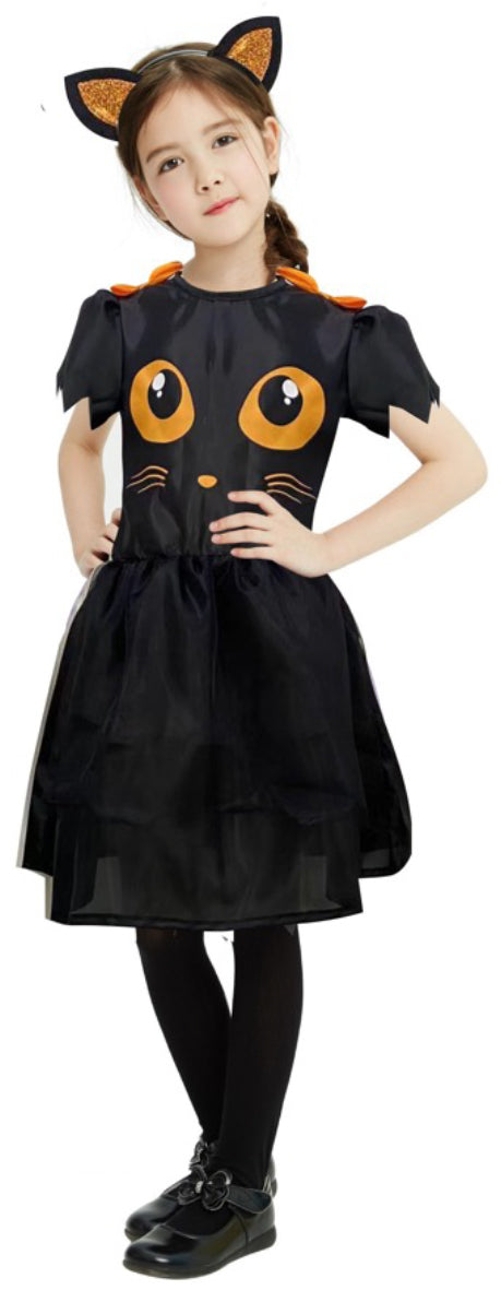 Suloinen lasten kissa-asu hurmaa kaikki Halloween tai pääsiäis-juhlissa! Mustassa mekossa on oransseja yksityiskohtia ja söpö kissankasvokuvio, ja asuun kuuluva panta täydentää lookin täydellisesti.