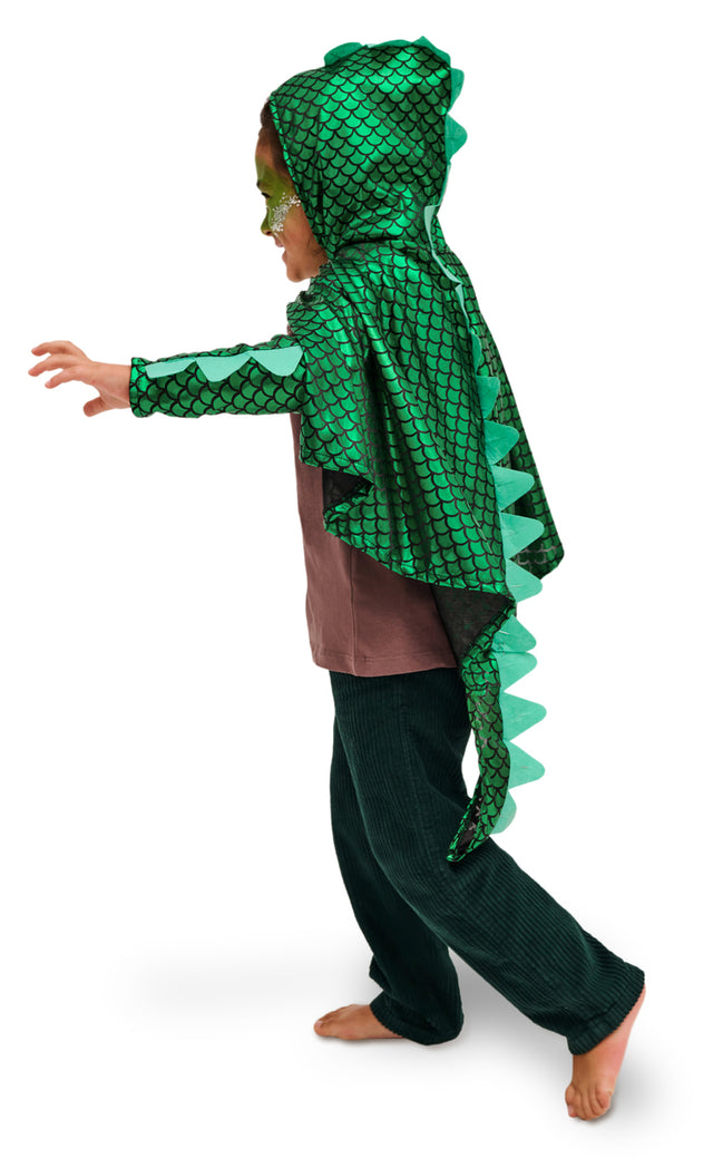 Herätä mielikuvitus eloon tällä upealla lasten lohikäärme-asulla! Vihreä asu metallinhohtoisilla yksityiskohdilla sopii täydellisesti naamiaisiin, syntymäpäiväjuhliin tai leikkeihin kotona. Asuun kuuluu kaksi erillistä hihaa sekä nappikiinnitteinen viitta hupulla, joka on helppo pukea päälle. Viitan selkäosassa on näyttävät piikit ja kiinteästi ommeltu häntä, jotka tekevät lohikäärme-lookista aidon ja jännittävän. Materiaali on kevyttä ja miellyttävää polyesteriä, joka mahdollistaa helpon liikkumisen leikeissä. Vain käsinpesu. Viitan koko on noin 91 x 63 cm, kauluksen ympärys 45 cm ja hihojen mitat 19 x 13,5 cm. Lasten one size -koko sopii useimmille 3–8-vuotiaille lapsille.