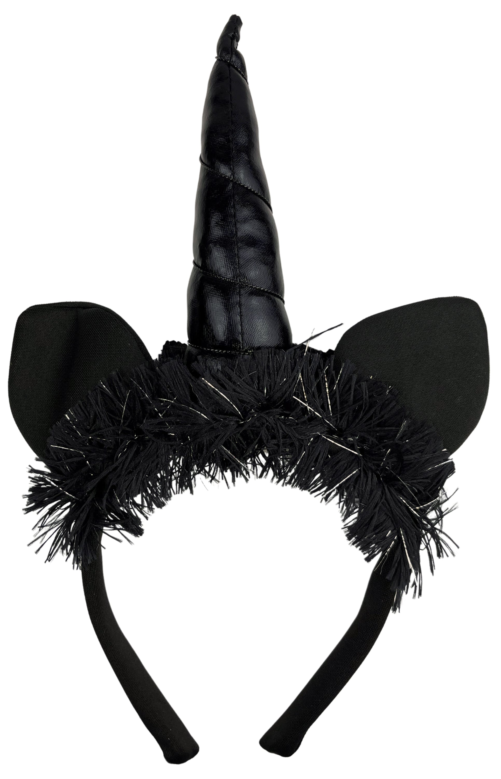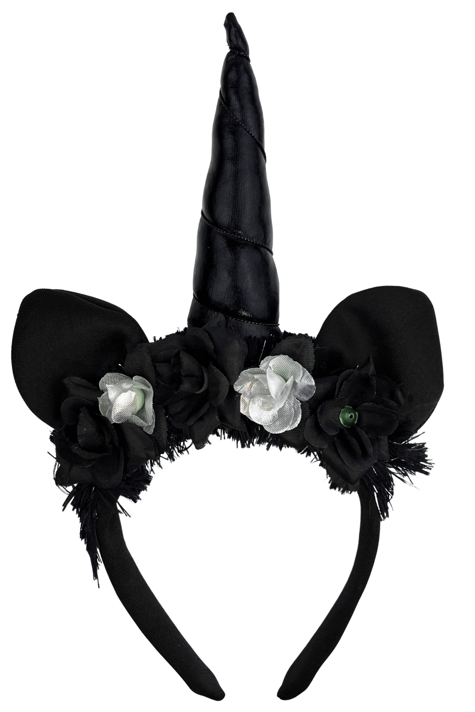 Tyylikäs musta yksisarvispanta, jota koristavat musta sarvi sekä mustat ja hopeiset kukat. Tämä näyttävä hiusasuste sopii erinomaisesti Halloweeniin, naamiaisiin ja muihin satumaisiin juhliin. Yhdellä pannalla loihdit helposti mystisen ja elegantin tyylin!