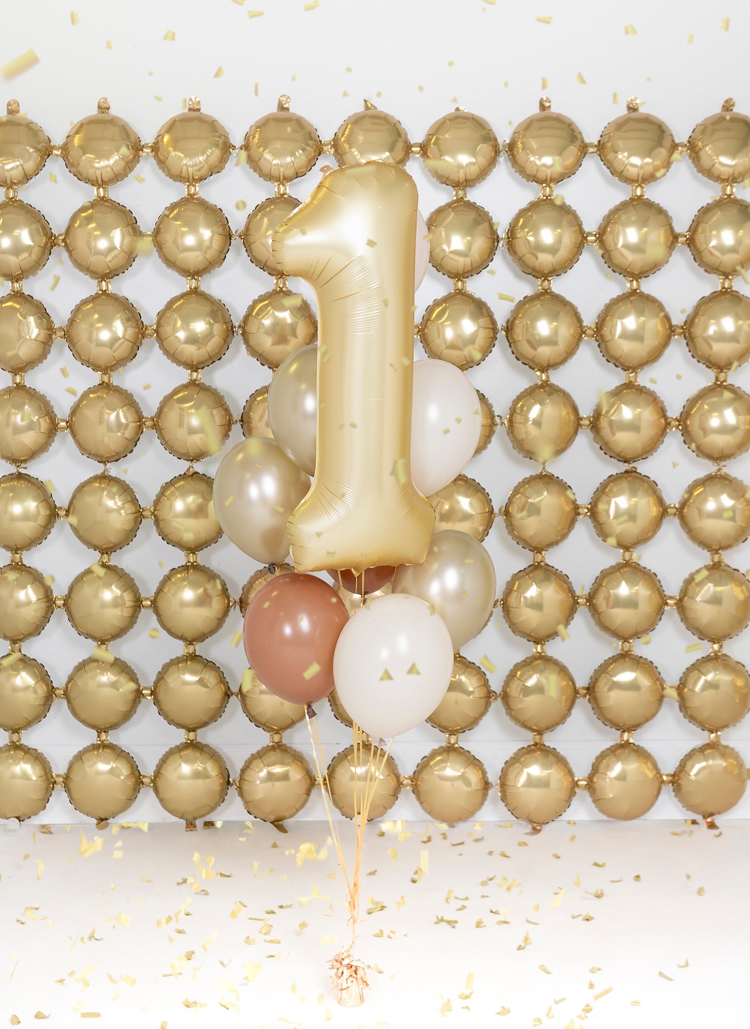 Valkokultaan vivahtava, satiininhohteinen kullanvärinen numerofoliopallo. Voidaan täyttää joko ilmalla tai ilmapalloheliumilla. Pallossa on ripustuksen helpottamiseksi ripustusaukot.