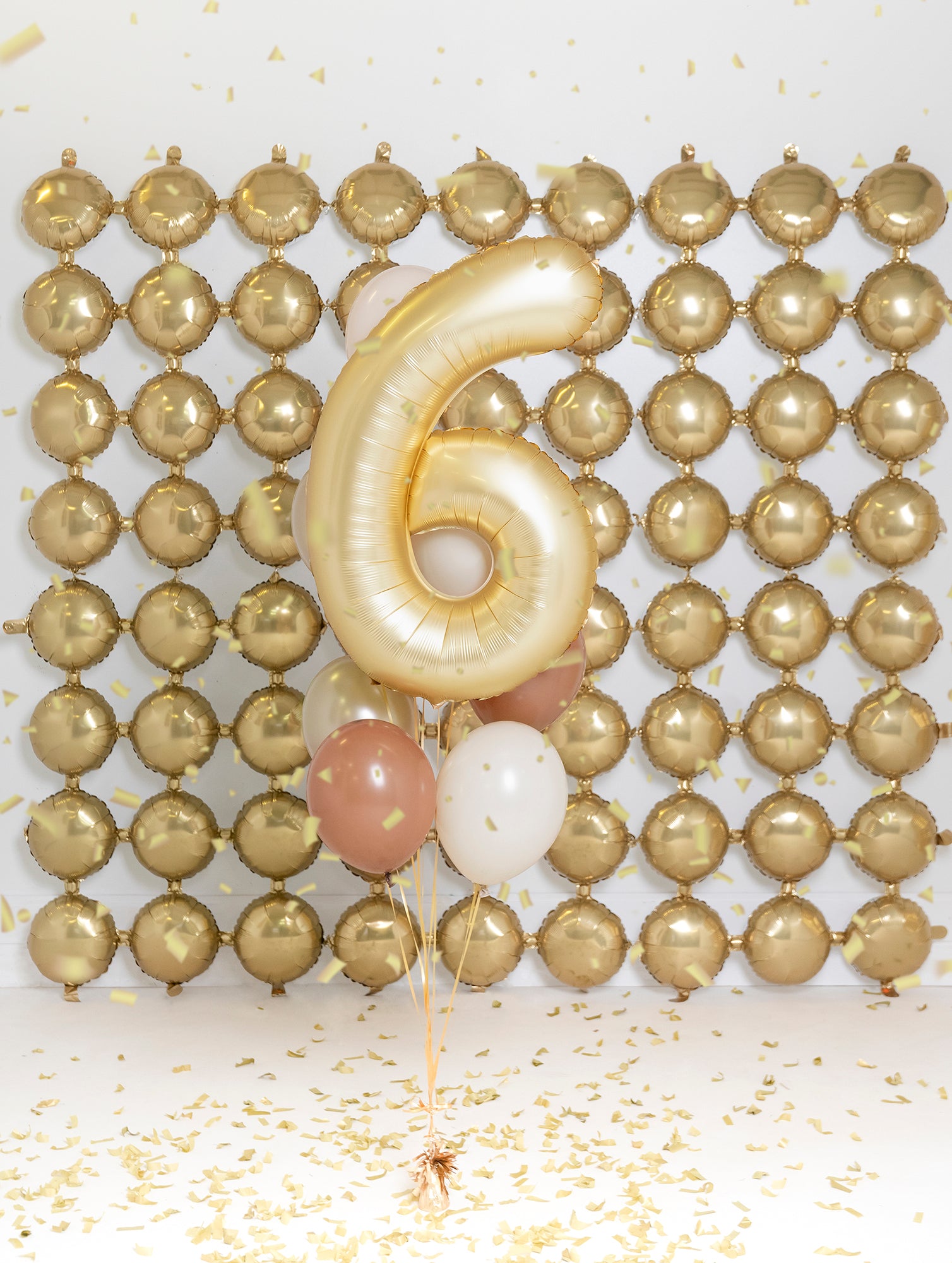 Valkokultaan vivahtava, satiininhohteinen kullanvärinen numerofoliopallo. Voidaan täyttää joko ilmalla tai ilmapalloheliumilla. Pallossa on ripustuksen helpottamiseksi ripustusaukot.