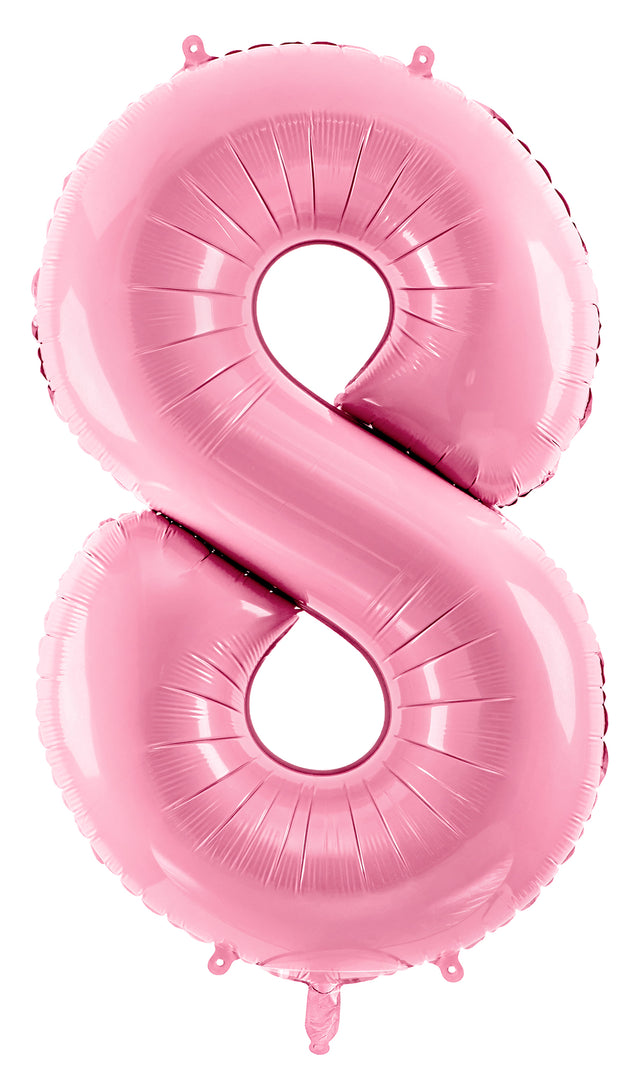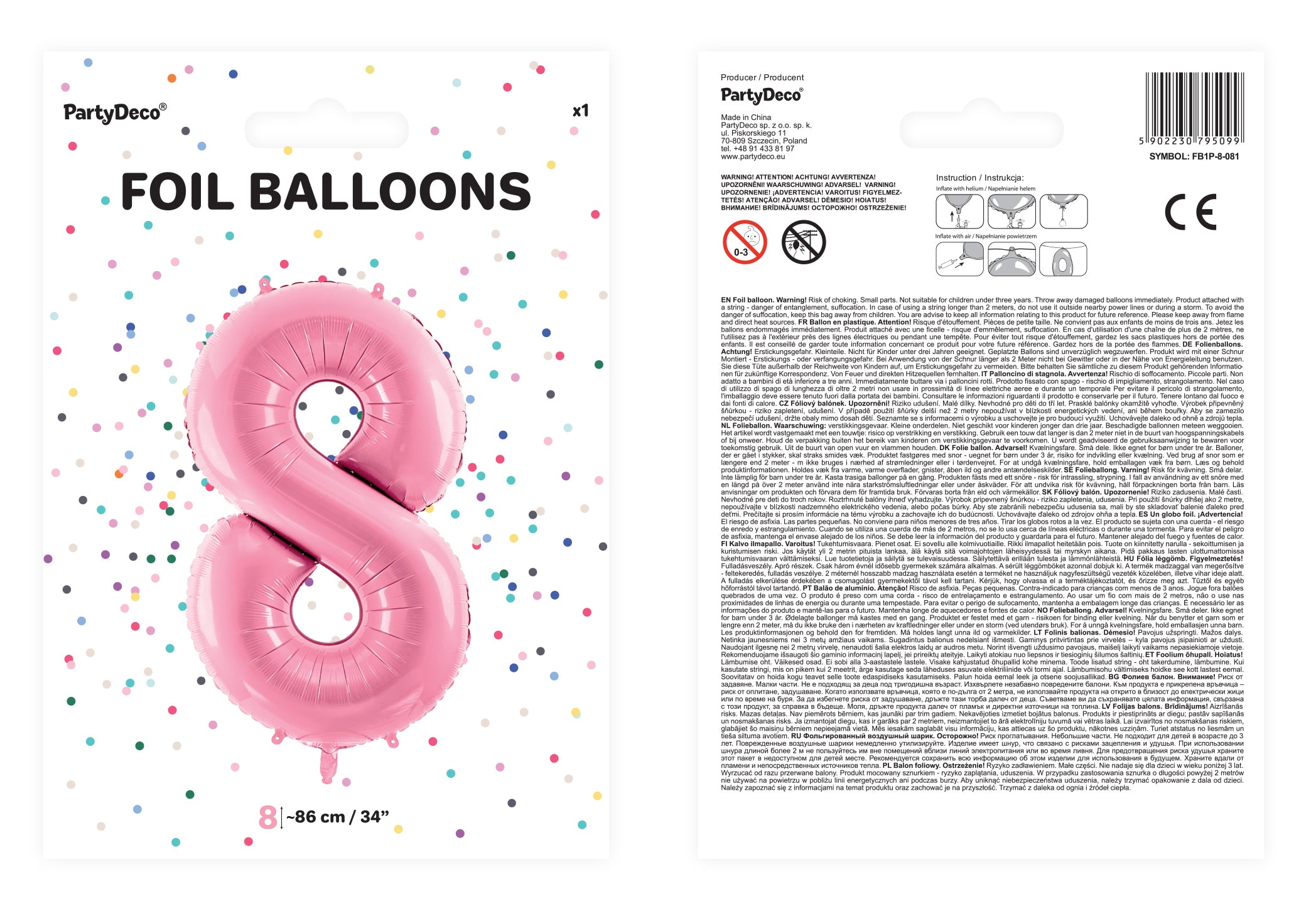 Pinkinvärinen numerofoliopallo. Voidaan täyttää joko ilmalla tai ilmapalloheliumilla. Pallossa on ripustuksen helpottamiseksi ripustusaukot.