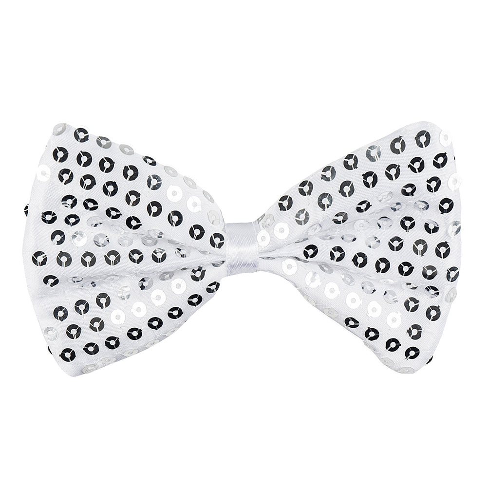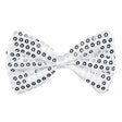 Aikuisten naamiaisasuste. Valkoinen rusetti hopeanvärisillä paljeteilla. Musta kuminauha pitää rusetin paikoillaan. Materiaali. 100% polyesteri.