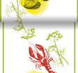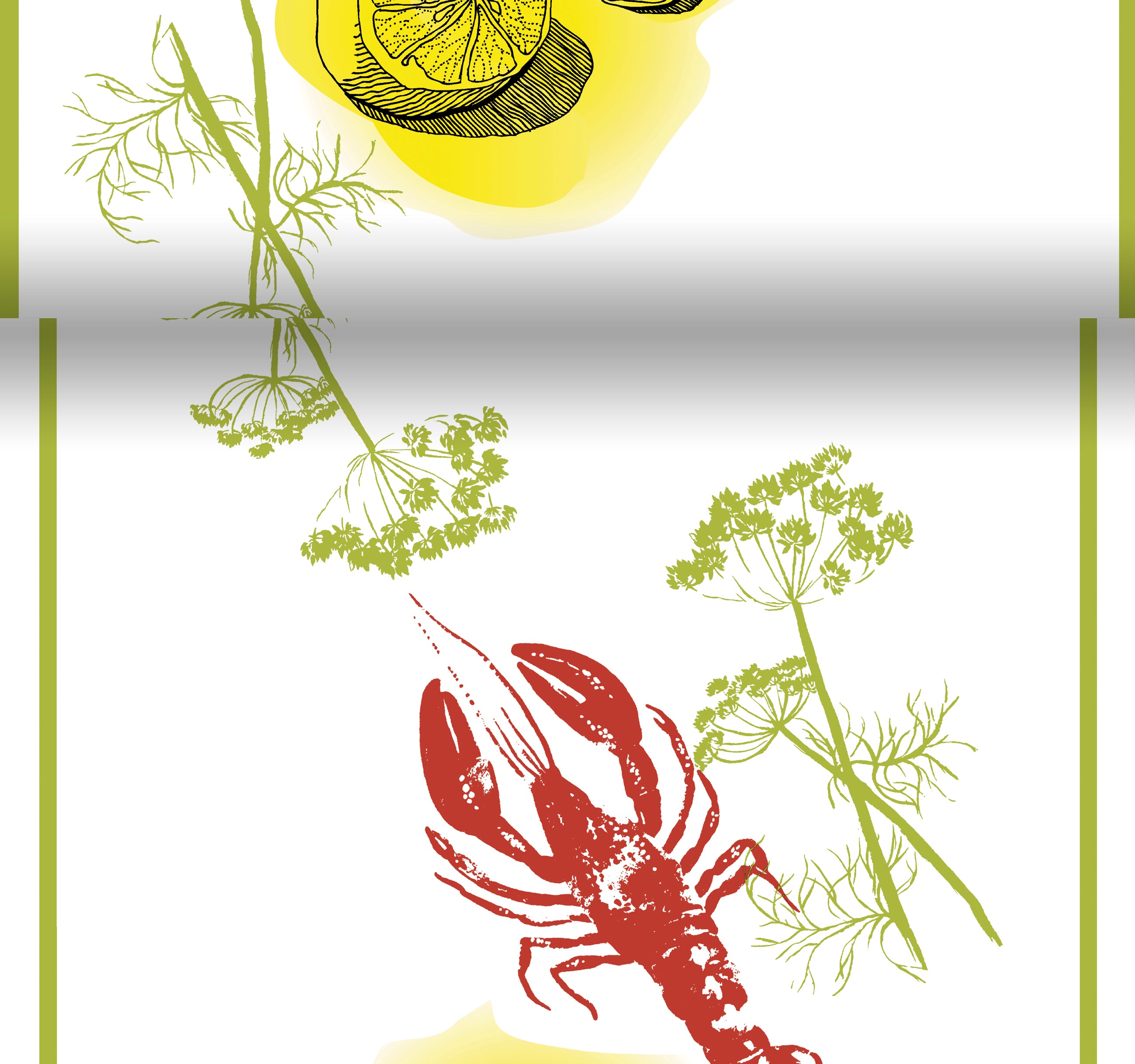 Valkopohjaisessa kaitaliinassa rapujuhlaan sopivat kuviot: rapu, sitruunat ja tillit.