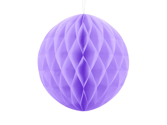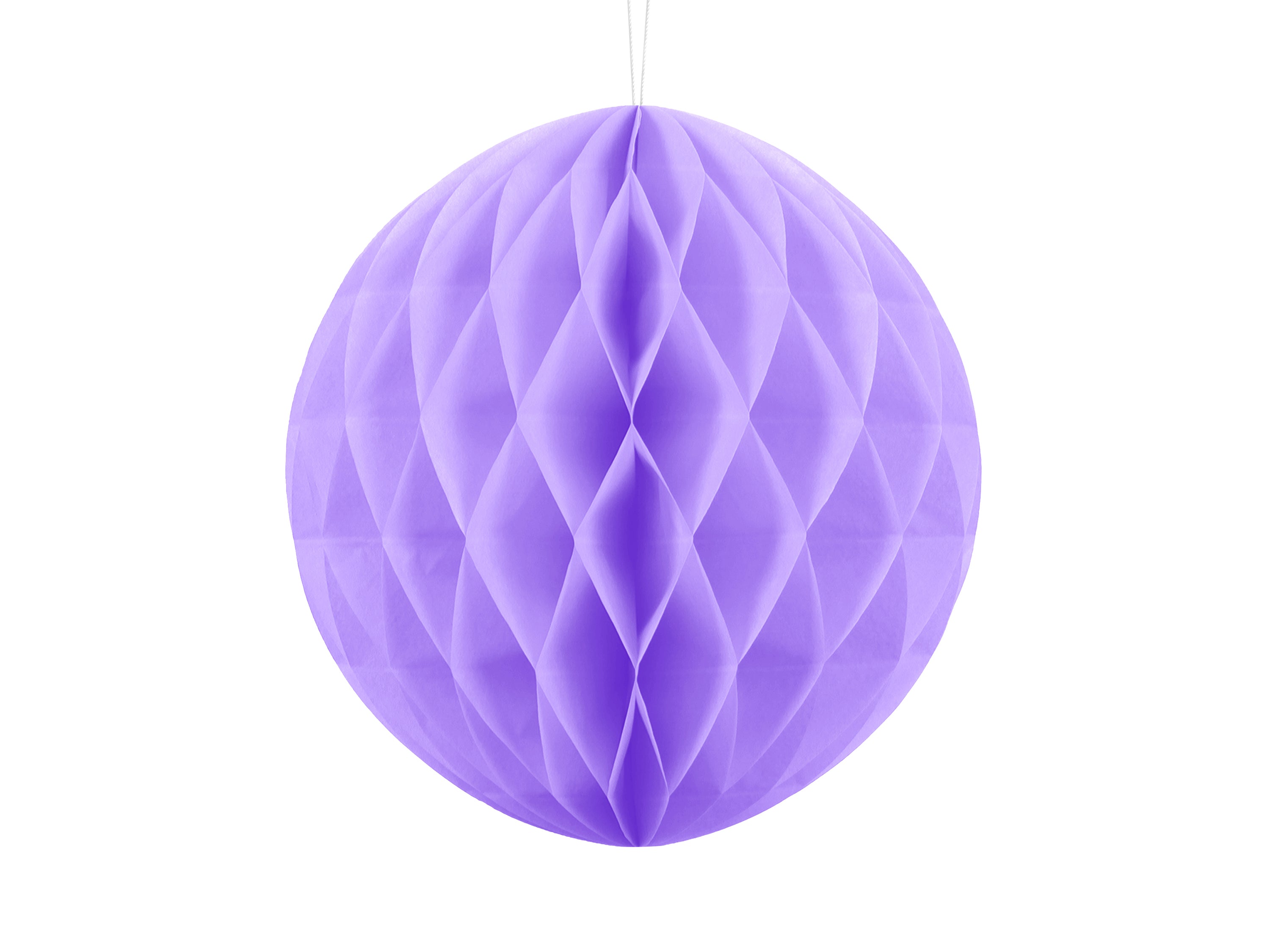 Liila hunajakenno koriste, halkaisija 30 cm. Tämä näyttävä ja kolmiulotteinen paperikoriste sopii ripustettavaksi yksinään tai yhdessä pienempien koristeiden kanssa. Materiaali 98 % kreppipaperi ja 2 % puuvilla tekee siitä ekologisen ja helposti kierrätettävän.