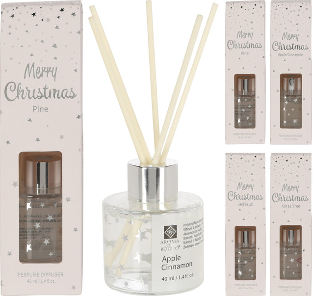 Jouluinen huonetuoksu lasipullossa 40 ml + 5 rottinkitikkua. 4 eri tuoksuvaihtoehtoa: mänty, omena-kaneli, punaiset hedelmät ja joulukuusi.