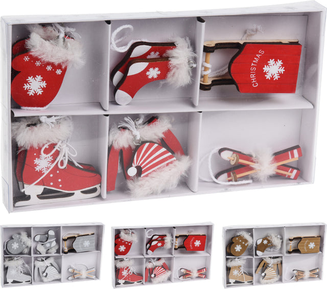 Myyntipakkaus sisältää 6  erilaista koristetta: kelkka, sukset, lapaset, luistimet, sukat sekä myssy/paita.