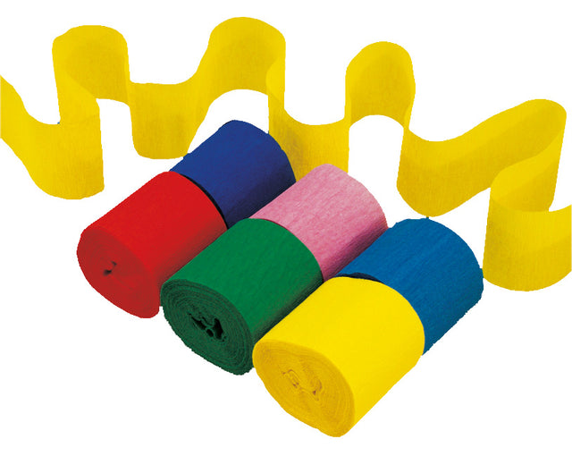 Lajitelma, värit: keltainen, sininen, tummansininen, vihreä, vaaleanpunainen ja punainen. Pakkauksessa 6 rullaa. Kreppinauhan leveys 5cm. Rullassa 10m.