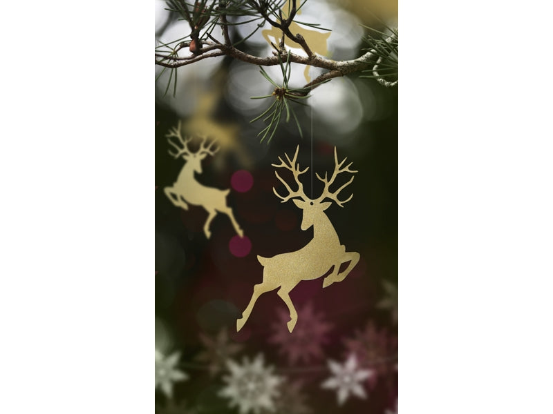 Paperikoriste Petteri Punakuono 10 kpl/pkt. Porot on tehty helmiäishohtoiselle kultaiselle paperille ja niissä on reiät ripustusta varten. Poron koko 9,4 x 14,5 cm.