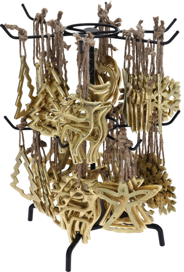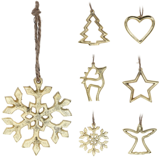 Kullanvärinen ripustettava jouluaiheinen koriste 10 cm. Metallia 1 kpl (6 eri mallivaihtoehtoa). Mallit: Poro, sydän, tähti, enkeli, joulukuusi ja lumihiutale.