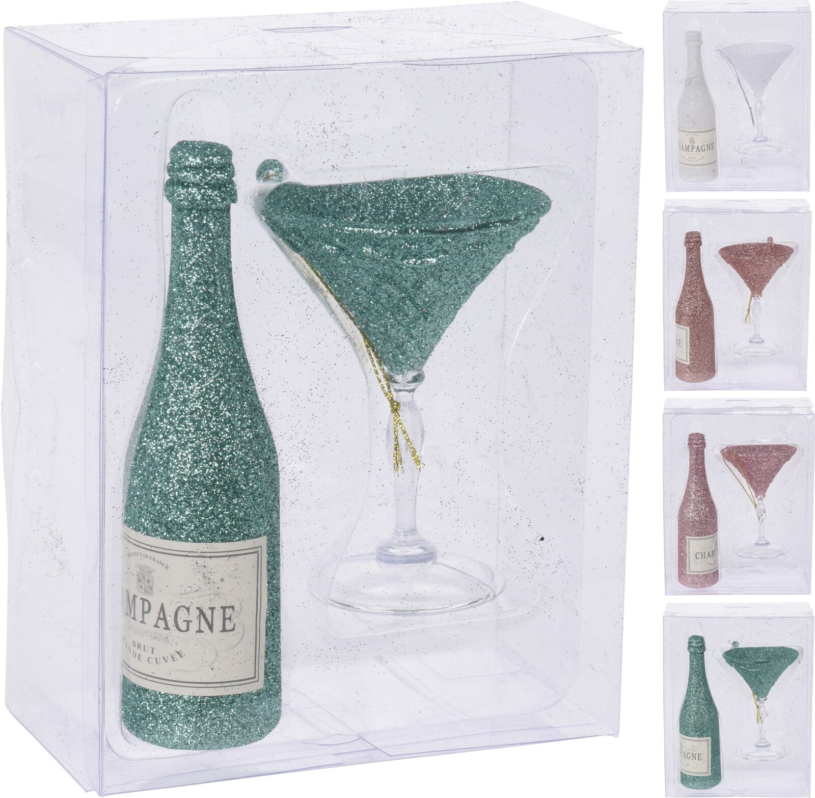 Ripustettava shampanjapullo ja lasi koriste joulukuuseen tai muuhun juhlakoristeluun. Pullokoristeen koko 14 x 6,5 cm ja lasin koko 9 x 3,5 cm.