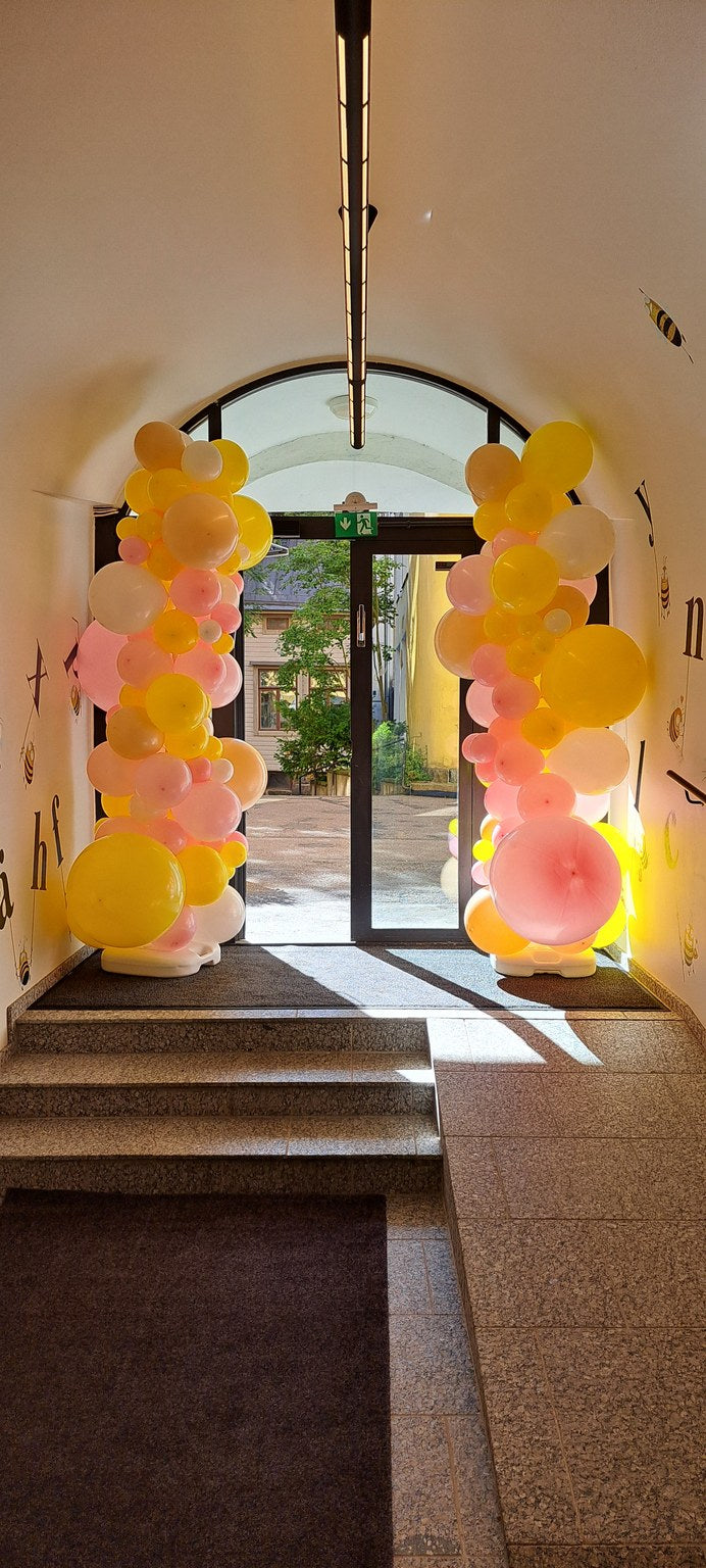Suora orgaaninen ilmapallopylväs on monikäyttöinen elementti tilasomisteena. Pylväillä kehystät esimerkiksi näyttävästi sisääntuloa tai esiintymislavan reunoja sekä ne toimivat kätevinä tilanjakajina. Erikokoisista kumipalloista toteutetun somisteen korkeus on noin 2 metriä.