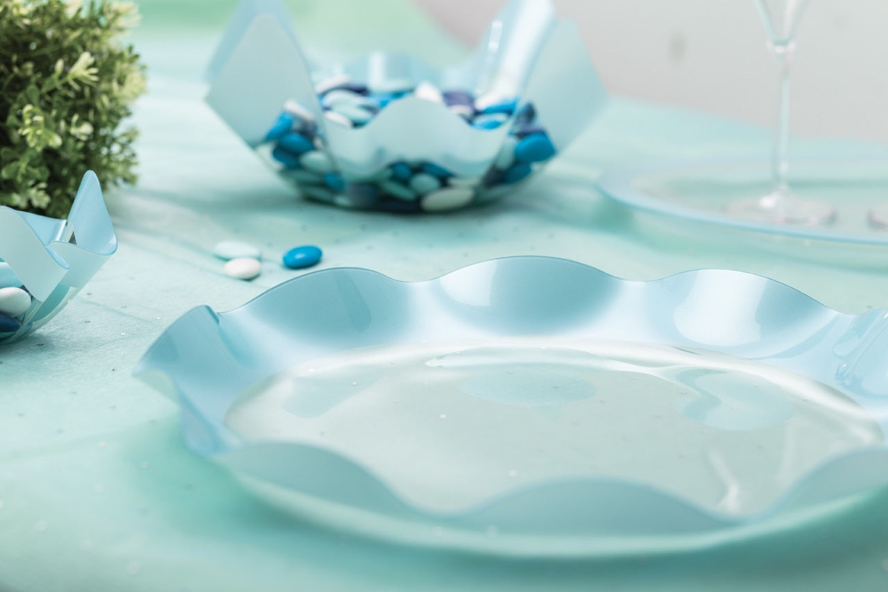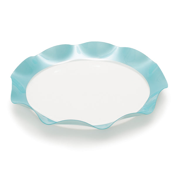 Tarjoilulautanen läpinäkyvää muovia. Lautasessa on kaunis aaltoileva vaaleansininen reunus. Tarjoiluastian koko on 32 cm.