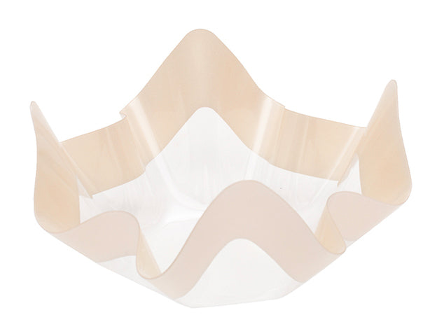 Läpinäkyvä tarjoilukulho aaltoilevilla reunuksilla ja shampanjanvärisellä koristeraidalla. Astian korkeus on noin 7 cm ja leveys noin 13 cm. Ylöspäin levenevän kulhon pohjan halkaisija on noin 6 cm.